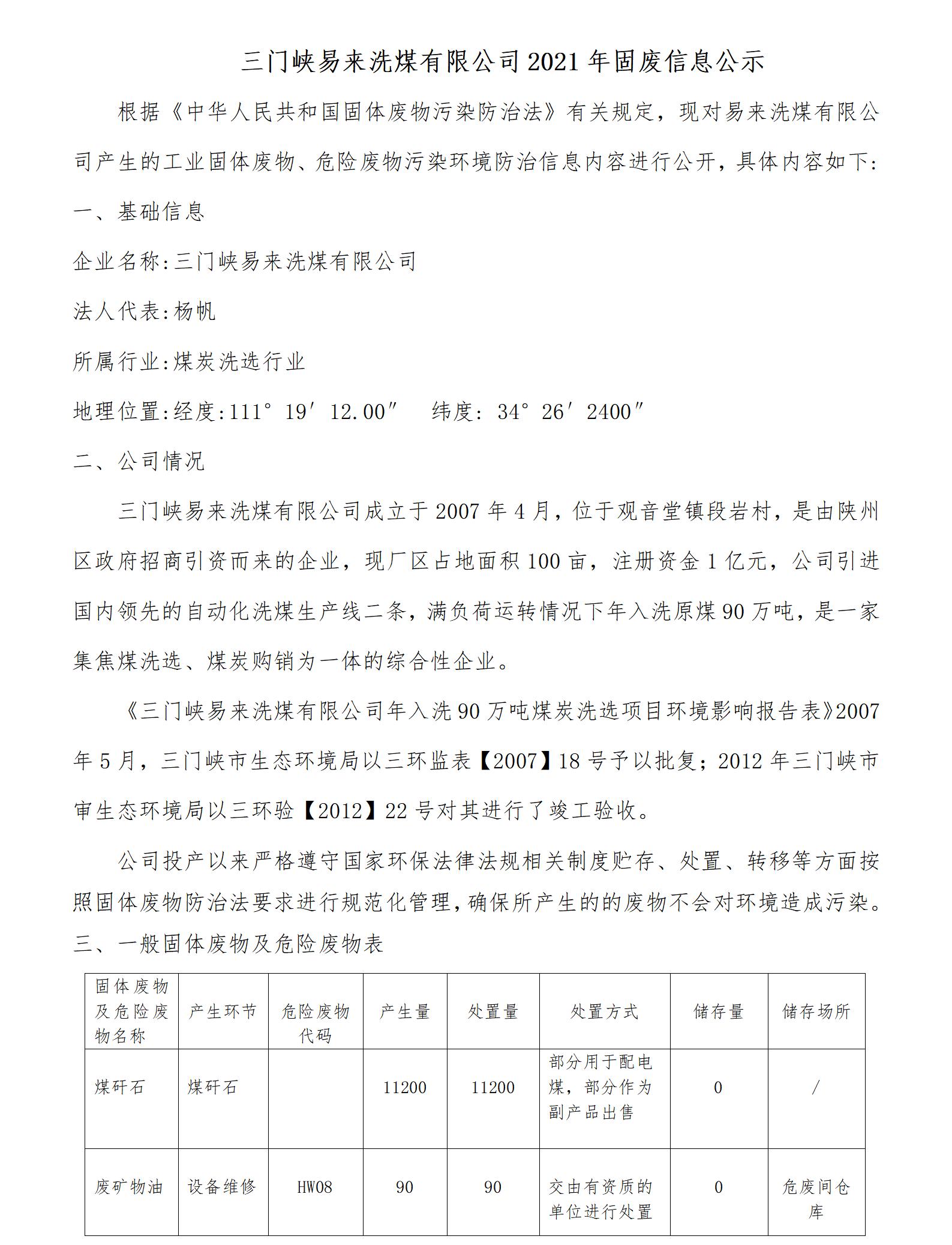 三門峽易來(lái)洗煤有限公司2021年固廢信息公示
